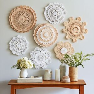 Turn your doilies into eye-catching wall art by framing them. Choose frames that complement your decor style, whether it’s rustic wood or sleek metal. Stretch the doily across the frame’s backing, securing it in place with glue or staples. Hang these framed doilies in a cluster for a gallery wall effect, or use them as standalone pieces to add texture and interest to your walls.
