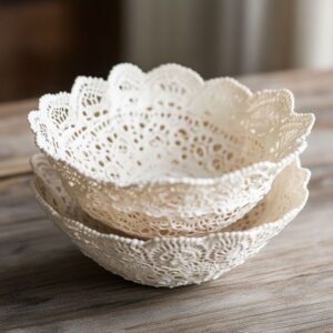 To make a lace bowl, you’ll need a doily, fabric stiffener, and a bowl to use as a mold. Soak the doily in the stiffener, then drape it over the inverted bowl, shaping it to form a bowl-like structure. Allow it to dry completely before carefully removing it from the mold. These delicate bowls are perfect for holding small trinkets or serving as decorative pieces on a coffee table or dresser.